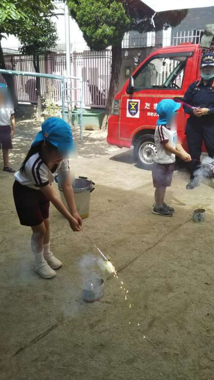 消防署の方が来てくださって、あやめ組に花火の安全な使い方、お約束を教えてくれました。聞いたお約束をお家の方にもちゃんとお知らせできるかな?