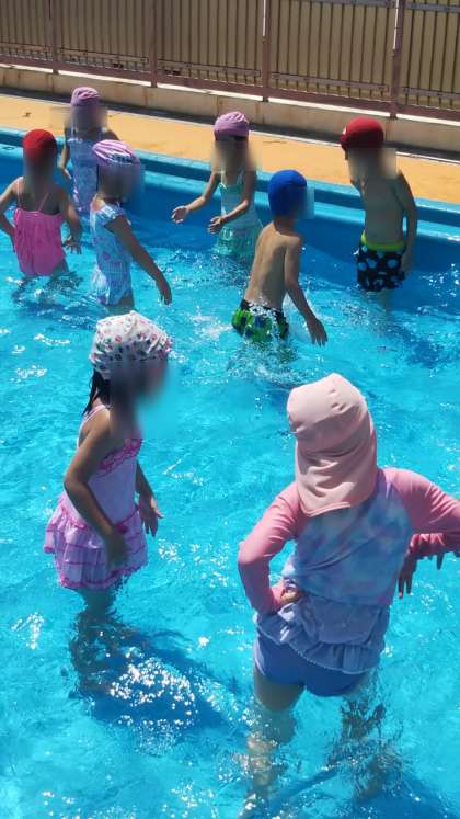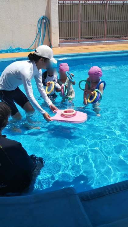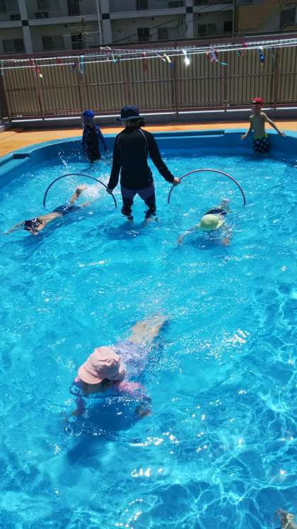 今日もいい天気。プール日和でした。あやめ組もさくら組も元気に水しぶきをあげていました!