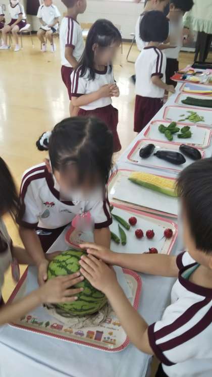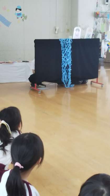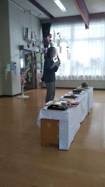 あやめ組が運んでくれたお供えを一つ一つ見て込められた願いや由来を聞きました。その後は先生たちがペープサートで七夕のお話をしました。最後はみんなでお供えを見ていきました。興味津々にさわったり匂いをかいだりしていました。