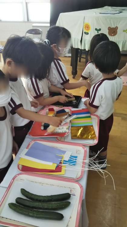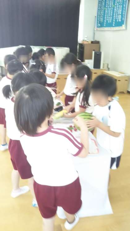 お供えの中でも今年は硯と墨に興味をもつこどもが多く、みんなじっくりと見ていました。スイカにも興味津々。