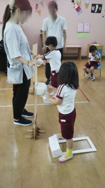 しゃがむ位置、またペーパーのちぎり方などを教えてくれました。お話の後は本当のトイレでチャレンジ!!…できたかな?
