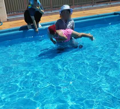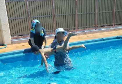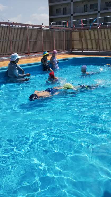 今日もあやめ組は少しずつ水に顔をつけてみたり、ロープをくぐったり、イルカジャンプにチャレンジしたりしていました。そんな中、ジャンプをしたい子どもが先生に飛ばしてもらおうと順番待ち…。