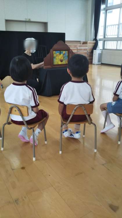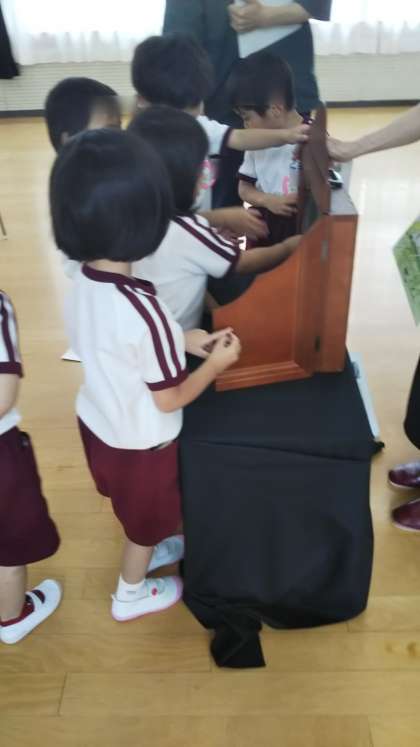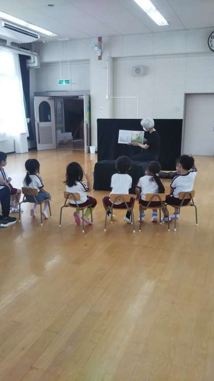 1学期最後のおはなし会でした。さくら組はいつも読んでいただく本に興味津々。終わった後には必ず近くにいって本に触れています。今日は紙芝居が気になって仕方なかったようです。紙芝居の舞台を見せていただいて大喜びでした!