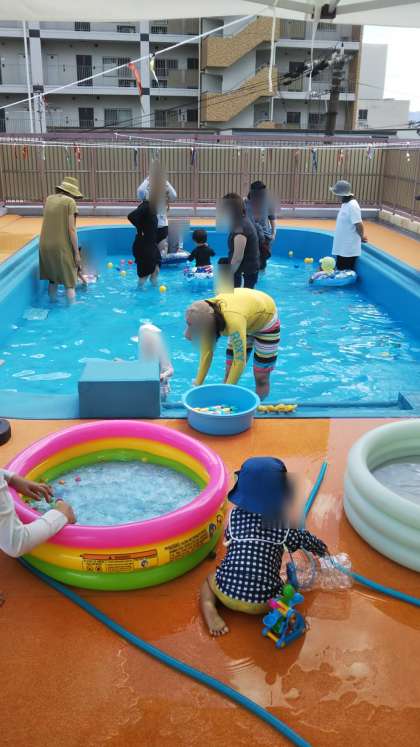 未就園のお友達のプール開放。浮き輪やボールなどでおうちの人と一緒に遊びました。たくさん遊べたね。参加ありがとうございました☆