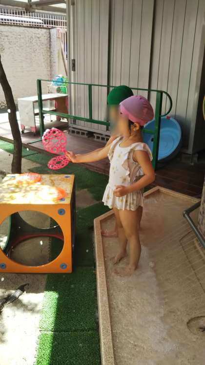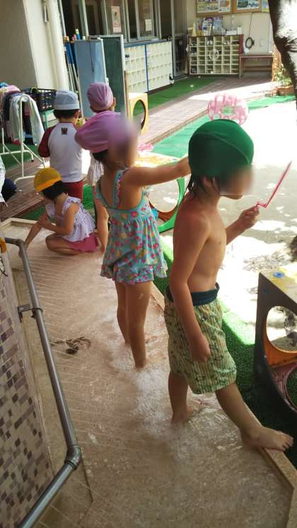 今日は1階のテラスと足洗い場を使っての水遊び!屋根の下で、心地よく水遊びをしていました。シャボン玉も楽しいね☆