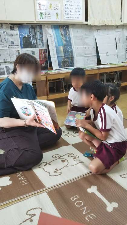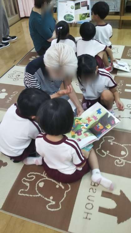 今日は図書館ボランティアの方が来てくださって、こどもたちにたくさん絵本を読んでくださいました。こどもが自分で選んだ絵本を、1人や2、3人の少人数でゆっくりと読んでもらうことができました。