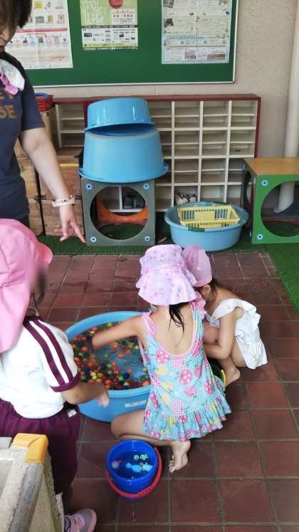 今日もくまちゃんでは水遊びを楽しんだり、ダンゴムシ探しをしたりしていました。毎日暑いけれど、水で遊んだり、日陰にいったりしながらたくさん遊びました♪