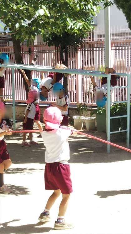 と、いうことで、水分補給や時間、場所に気を付けながら園庭でも遊びました。みんな楽しそう。
