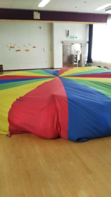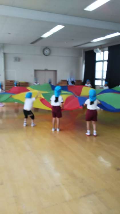 あやめ組がパラバルーンで遊びました。「前のあやめ組さんしてた!」と興味津々。先生にバルーンはみんなの気持ちをあわせるのが大事だよと教えてもらって、楽しそうにしていました。