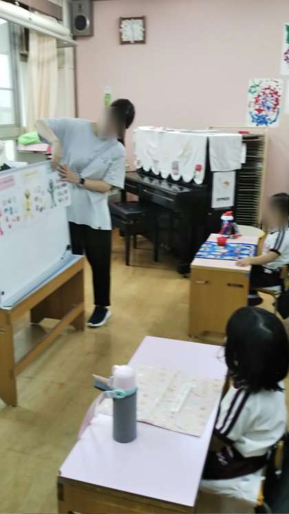 今月の保健指導は、三色栄養についてでした。赤、黄、緑の栄養の役割や、どんな食べ物があるかを聞き、バランスよく食べることの大切さを教えていただきました。