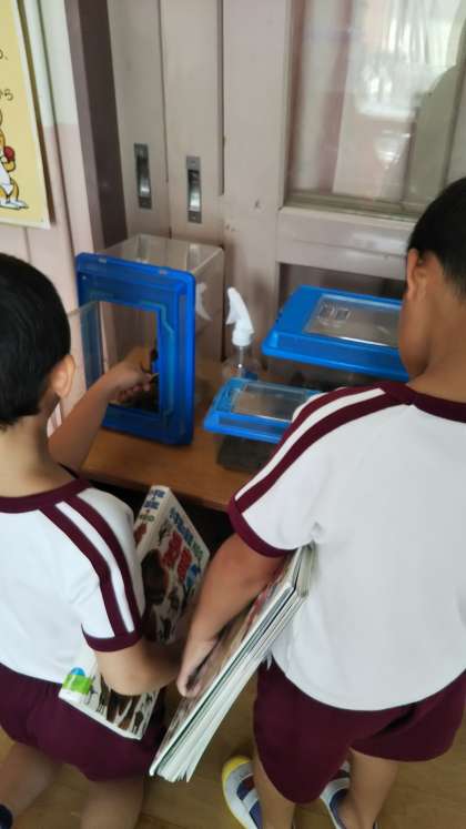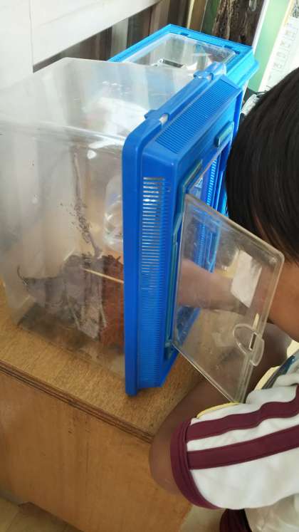 図鑑で飼い方を調べてお家をつくっていました。今日はごはんをあげてみました。しっかり食べてくれて良かったですね。