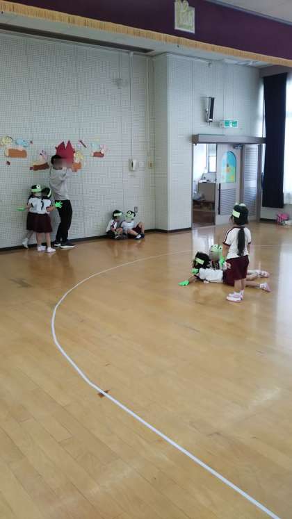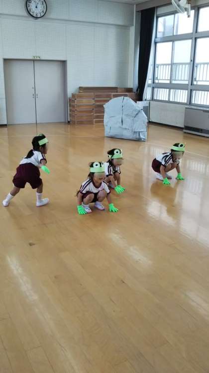 さくら組が可愛いカエルに変身☆ザリガニさんから隠れたり、だるまさんがころんだをしたりして遊んでいました♪