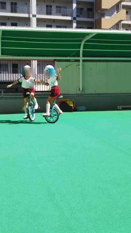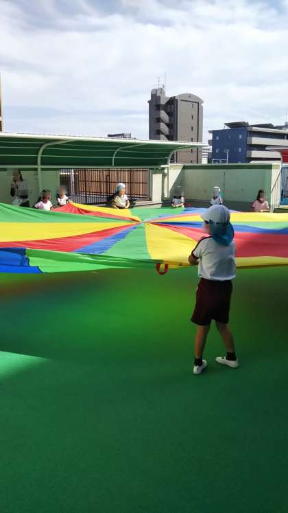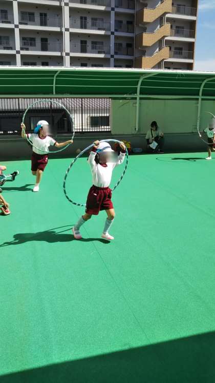 日曜日の雨で今日は残念ながら校庭にいけませんでしたが、あやめ組は屋上でチャレンジやバルーンをしました。
