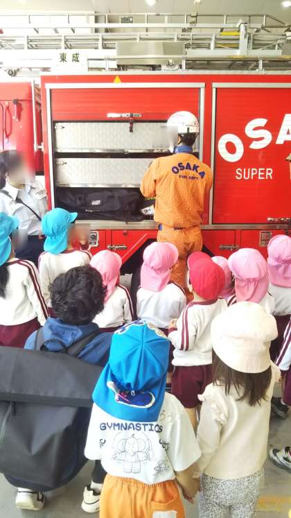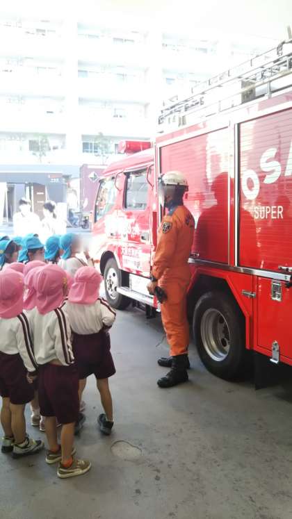 消防車や救助車などを説明していただきました。救助に必要な道具やなが〜いホースを見せていただいたりして子どもたちも興味津々でした。