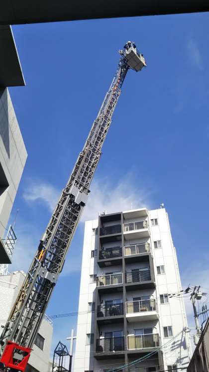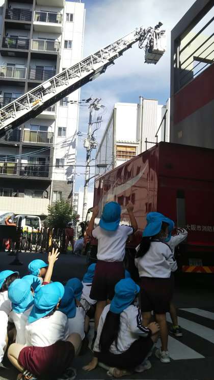 はしご車も見せていただきました。先生が乗ってたか〜〜〜く上がっていきます。子どもたちは大喜びで手をふっていました!