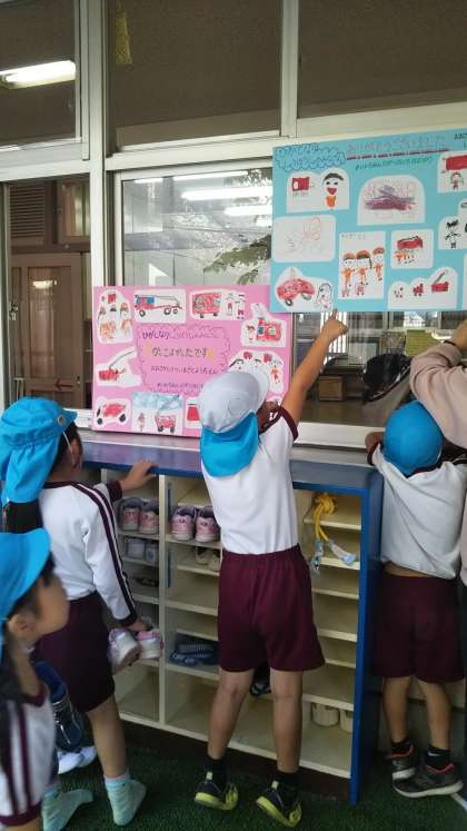 園に戻ってから、お礼の手紙をかきました。「はしごが伸びて凄かった」「ホースぐるぐるしてた」…と消防車を思い出しながら丁寧にかいていました。