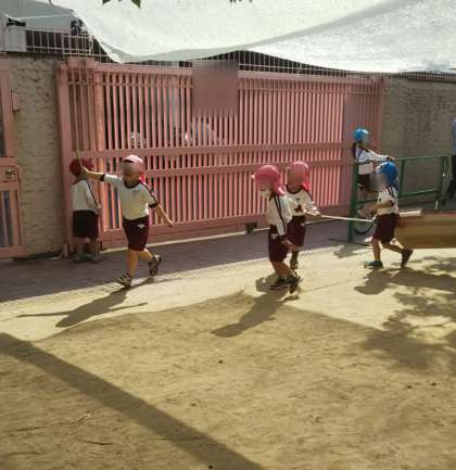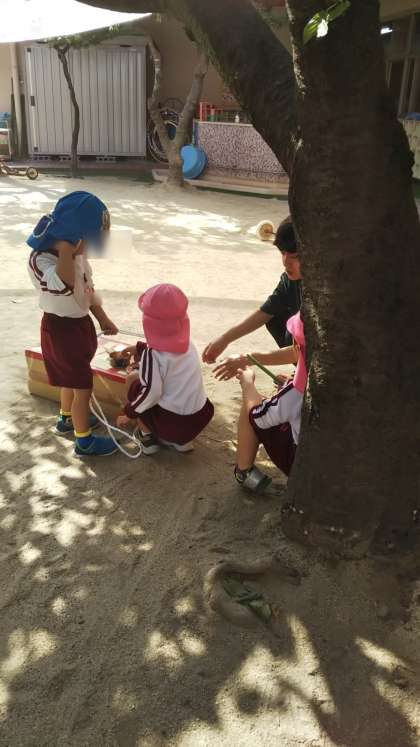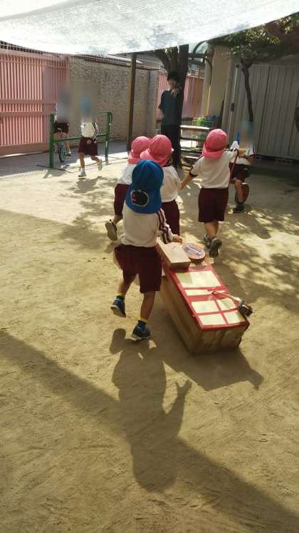 さくら組は今日もだんじりごっこを楽しんでいました。壊れては修理をしているようです。ばらちゃんのお友達も興味津々に見ていました。