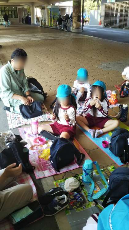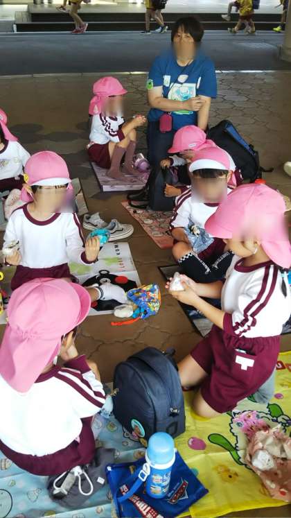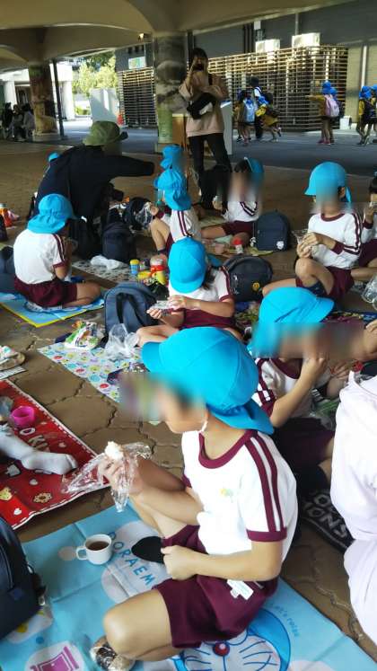 いっぱい歩いてお腹がペコペコになりました。途中からは「お腹減ったー!」コールも…。うれしいおむすびタイムです☆美味しいね♪