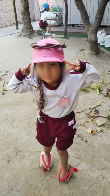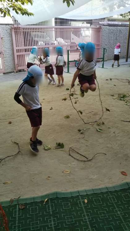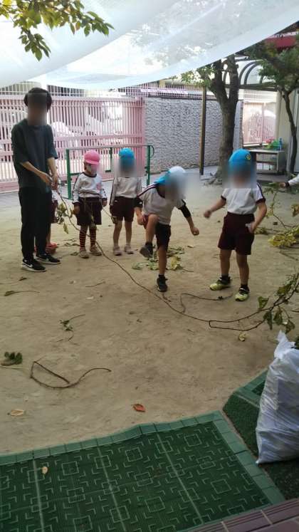 寺尾農園さんでいただいてきた芋づるで遊びました。縄跳びや、冠、綱引き…楽しそうでした。