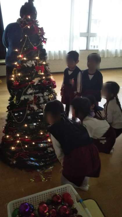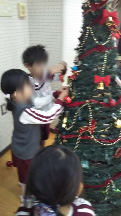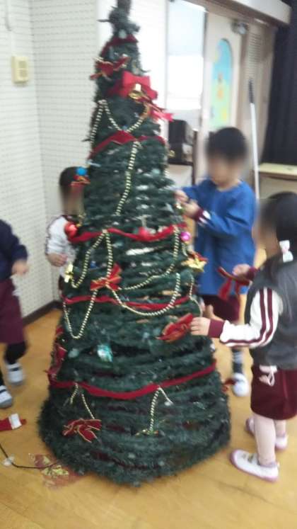 そして、今日は本物?ツリーに飾りつけをしました。「ピカピカの飾りや!」「星つけたい!」と楽しそうに飾っていました。