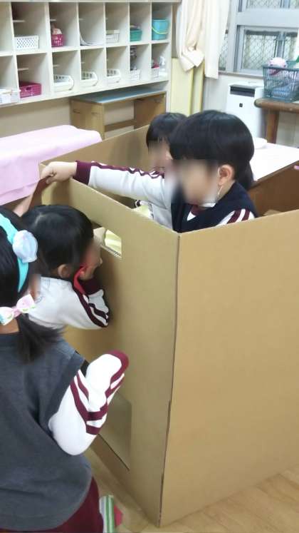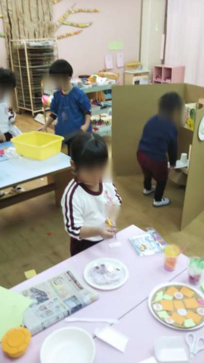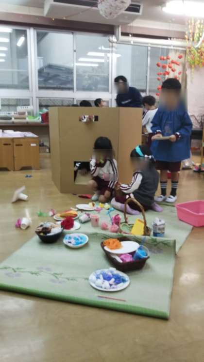 ままごとや、自分たちで作ったごちそうを使って自動販売機ごっこをしています。自ごちそうがいっぱい出てきていました。