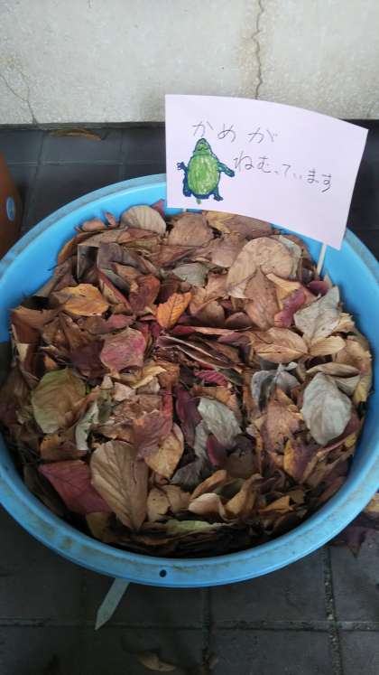 寒くなってきました。幼稚園のカメさんやカエルさんは葉っぱの布団でそろそろ冬眠準備です。