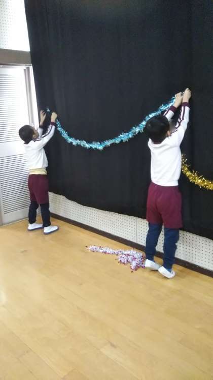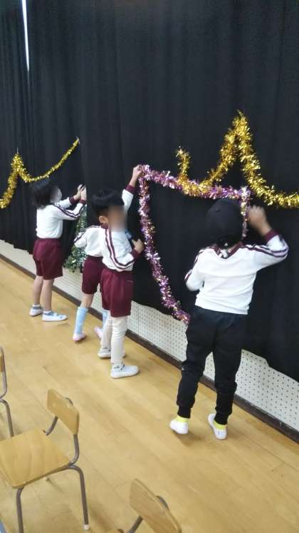 あやめ組が遊戯室の飾り付けをしています。キラキラきれいな飾りがいっぱい!楽しみだね♪