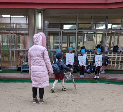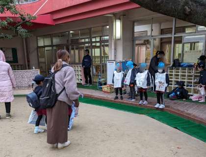 今日からあやめ組のあいさつ当番です。今日は少し天気が悪かったのでテラスで「おはようございます」元気な声が聞こえていました。