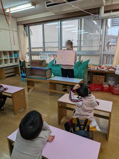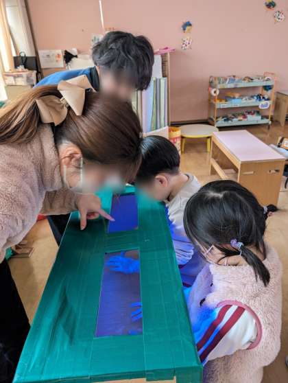 今月の保健指導は「手洗い」でした。石鹸できれいに洗った(はず)の手を魔法のライトに照らしてみると…洗えていないところが白く光って、子どもたちは「わあー!白い!」「真っ白やな!」とびっくり。