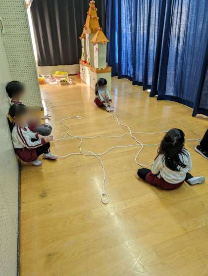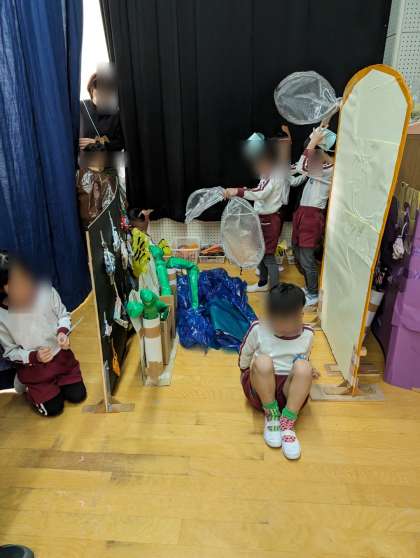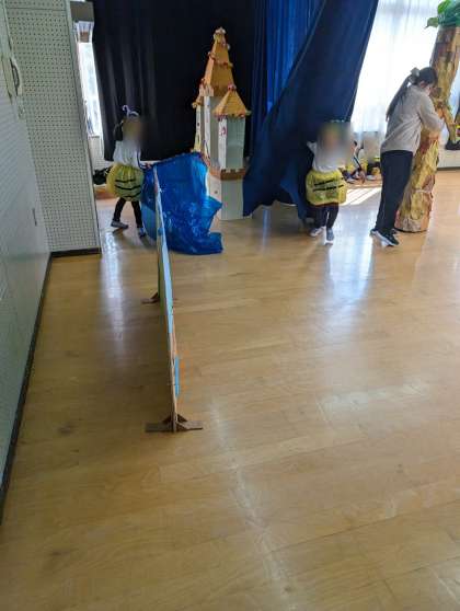 生活発表会でした劇あそび。幕(カーテン)の裏側でもこどもたちは大忙し。色々な用意をしたり、着替えたりしていました。少しだけ裏側の様子をお届けです。