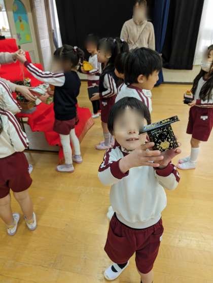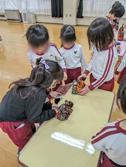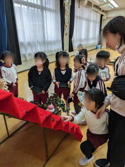 今日はあやめ組さんが雛人形を飾ってくれました。「これはどこに飾るのかな?」と写真と見比べて飾っていました。きれいに飾れて大満足!「明かりをつけましょぼんぼりに〜」と歌声も聞こえてきました。