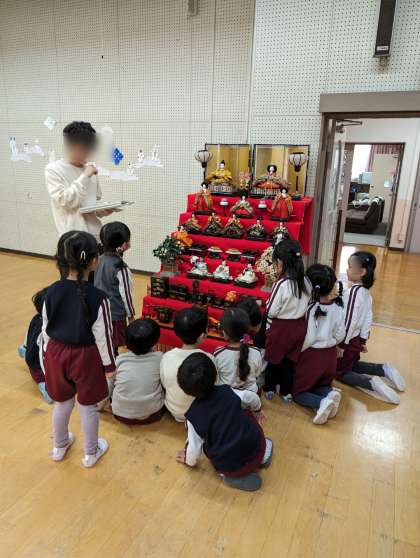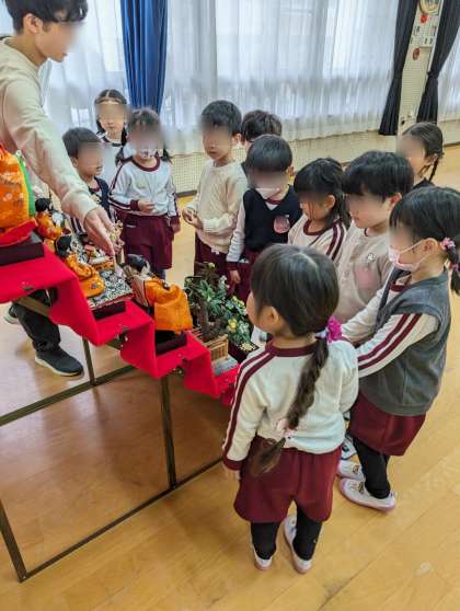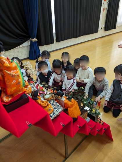 さくら組も雛飾りを見に行きました。「お姫様かわいいね」とニコニコ。ぼんぼりに明かりがつくと歓声があがっていました。