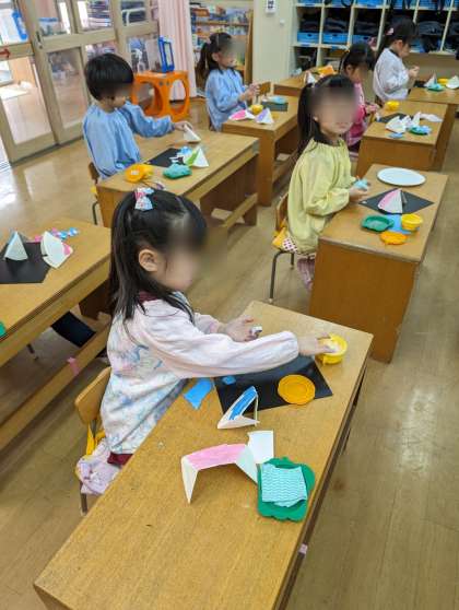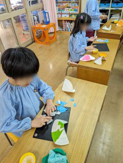 あやめ組がひな人形を作っていました。紙皿を折って千代紙や色紙をちぎって着物のように貼っていきました。細かく丁寧に作っていました。