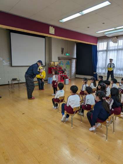 安パトさんと、警察の方があやめ組に就学前の交通安全指導をしてくださいました。
