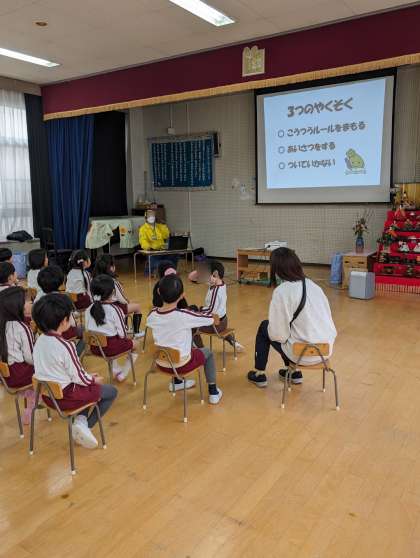信号の渡り方や、道路の歩き方を教えていただきました。防犯ブザーやこども110ばん、みまもりたいの方のことなども知ることができました。最後に警察の方の話も聞きました。もうすぐ小学校、自分で車や色々なことに気をつけて安全にいけるようにしたいですね。保護者の皆様、ぜひ就学前にこどもさんと通学路を確認してみてください。