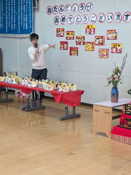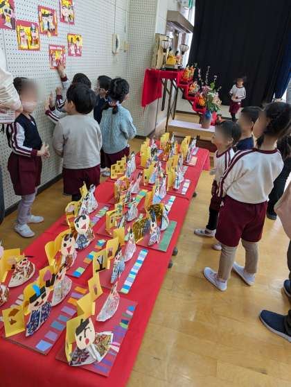誕生会のあとはひなまつりの会、ひな飾りの話を聞いたり、みんなが作ったひな人形を見たりしました。おはようおばさんからはひなあられもいただかきました。