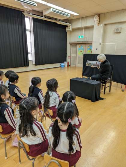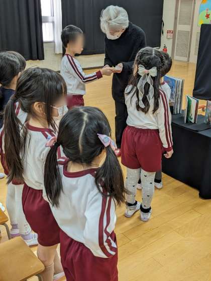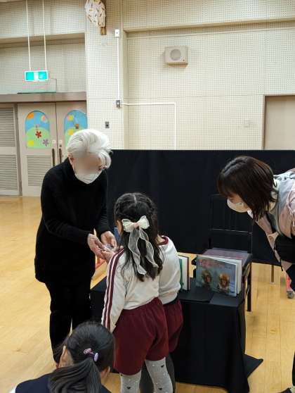 あやめ組さんにとっては最後のおはなし会でした。たくさん素敵なお話を聞かせていただけて嬉しかったですね。あやめ組からもプレゼントをお渡ししました。「(学校に行っても)幼稚園の前を通るようにするから(会えるね)」と言ったり、ぎゅっと抱きつきに行ったりしていました。学校に行ってもまたお話が聞けると嬉しいですね。