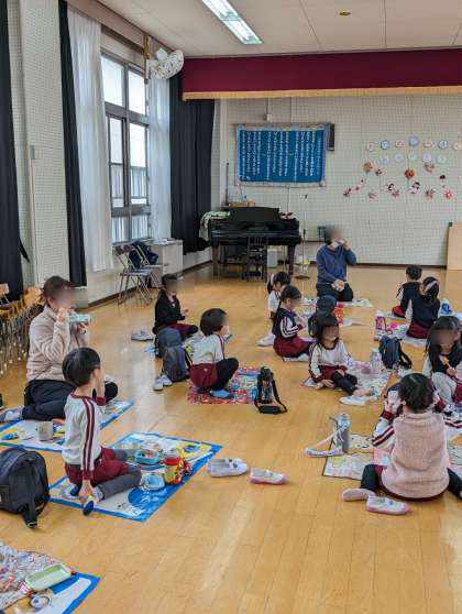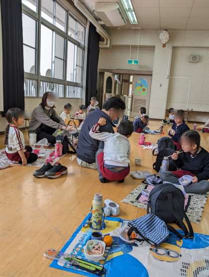たくさん遊んだあとはお互いにプレゼントを渡しました。気持ち画たくさん入ったプレゼント、大切にしようね。会が終わった後はみ〜んなで一緒にお弁当を食べました。