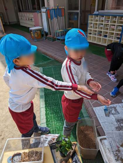 今日はカナヘビさんの日向ぼっこ。こどもたちがすぐに気づいて、可愛い!触りたい!とやってきました。触り方もすっかり慣れて優しくかかわっていました。そして、カブトムシさんの土もお掃除!フンを取って土をフカフカにしていきました。さくら組さんが、お手伝いにきてくれました。