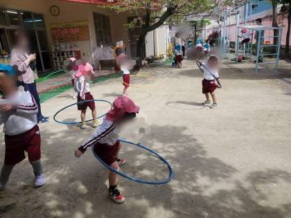 お庭でスケーターやフラフープ、先生とお相撲ごっこなどなど…園庭に賑やかな声が響いています♪