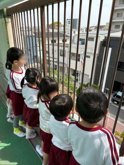今日から園庭にこいのぼりが上がっています!あやめ組さんがみんなでポールのヒモを引いてあげてくれました。『こっちから(こいのぼりが)よく見えるよ〜』と、近くから見るより、少し離れた方がよく見えることに気付き、友達や先生に知らせてました。その後、園舎屋上に上がって、『ここからもこいのぼりが見える!!』と、いろいろな場所からこいのぼりを見て楽しんでいました。