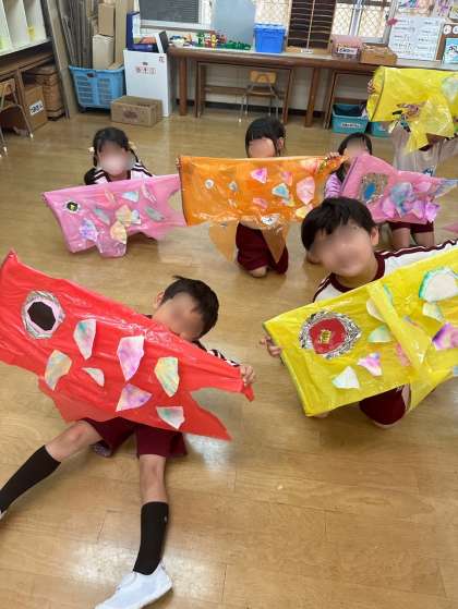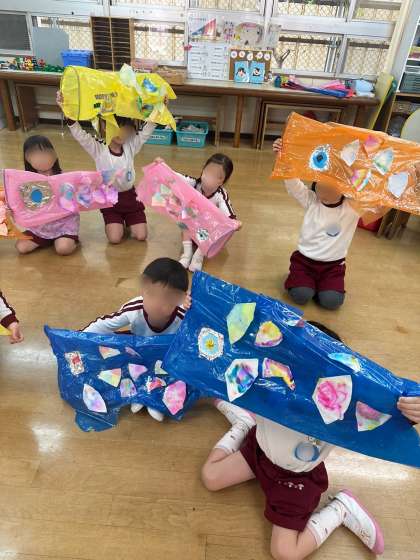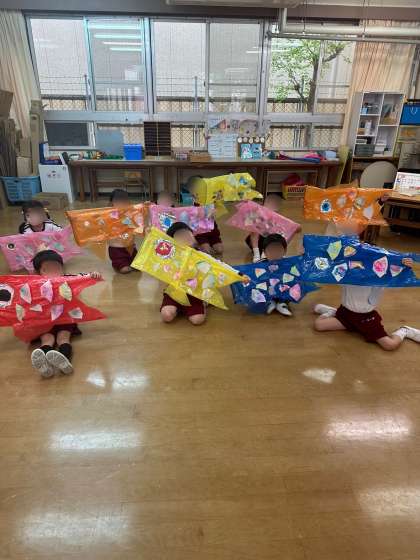 昨日作ったコーヒーフィルターをこいのぼりのうろこにして貼っていました。『見て〜(うろこが)ヒラヒラするんだよ!』と丁寧に貼ったうろこ1枚1枚をとても嬉しそうに見せてくれました。どのうろこもとてもキレイで、とても素敵なこいのぼりができました!