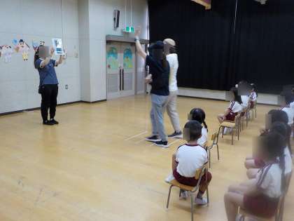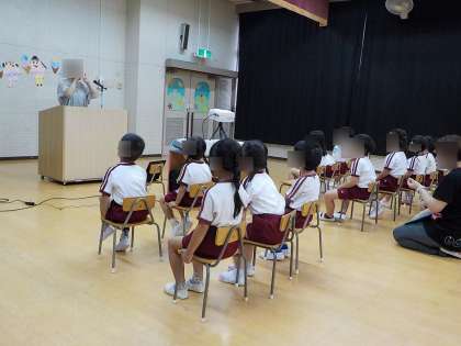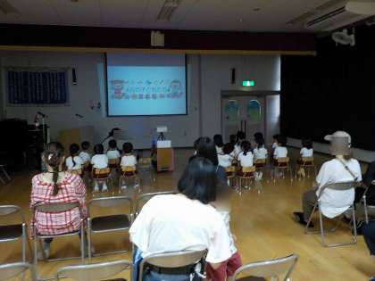 一学期の幼稚園での生活をみんなで振り返ったり、保育室で歌ってきたうたをお家の方に聞いてもらったりしました。また、夏休みの安全な過ごし方について、先生たちが交通安全指導をしました。