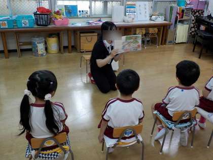「ねこすけくん なんじにねたん?」の絵本を読んでくださり、早寝・早起き・朝ごはんの大切さを教えてもらいました。