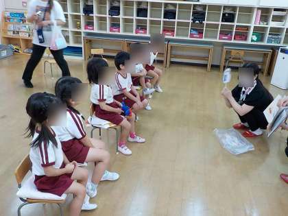 今日はさくら組に区役所から2名の方が4歳児訪問にきてくださいました。