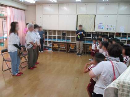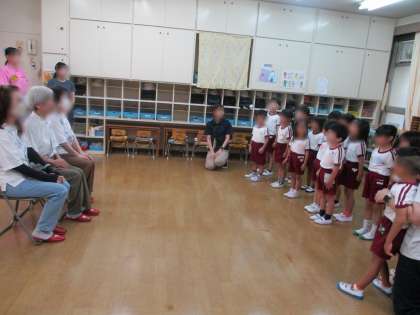 また、1学期にいつもお世話になっているおはようおばさんに「歌のプレゼントをしよう」と楽しみにしていた子どもたちでしたが、あいにくの雨でお会いすることができずに1学期が終わってしまいました。「2学期にきいてもらおう」と楽しみにしていたので、今回、保育室で歌をきいていただくことができました。