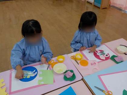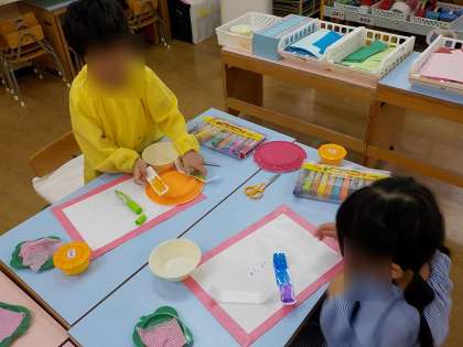 「私もお誕生日の時にあやめ組のお兄さんからプレゼントもらったよ」と自分がプレゼントをもらった時のことを思い出したり、「早くプレゼント渡したいな」とお友達に渡すのを楽しみにしたりしながら、気持ちを込めてつくる姿が見られました。「つくったもので僕たちも遊びたい」と先にさくら組のみんなでおもちゃを使って遊ぶことも楽しみましたよ。