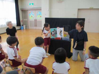 興味津々でお話を聞く子どもたち。毎月の楽しみの時間です。