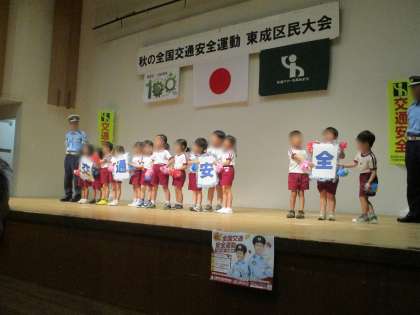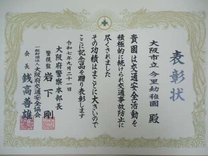 9月19日 東成区民センターで開催された『秋の交通安全運動 東成区民大会』で、交通安全活動優良学校園として、表彰していただきました。