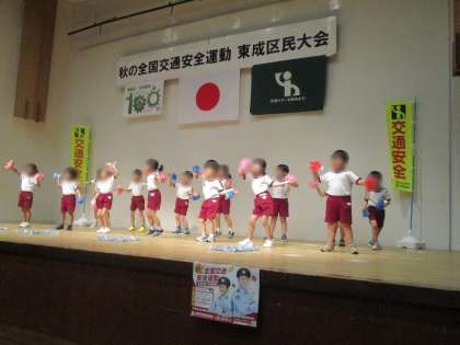 第2部では、5歳児あやめ組がオープニングのダンスを披露しました。また、親子で交通安全指導を受けることもでき、交通ルールを守る大切さを改めて感じる機会となりました。